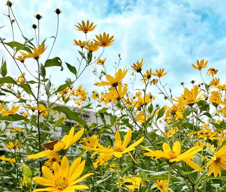 春から夏にかけては、太陽を追いかけるように伸びる茎と、黄色い花を咲かせる姿が印象的。