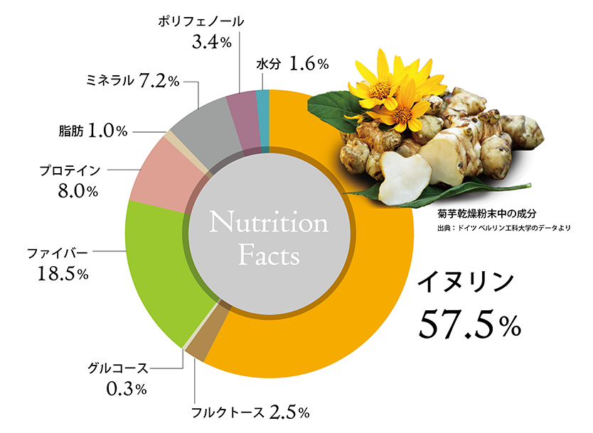 例えば乾燥粉末の菊芋に含まれる「イヌリン」はなんと半分以上の57.5%も占めています。その他の成分も、ファイバーやプロテイン、ポリフェノールなどといった美容と健康には欠かせない栄養素で構成されていて、イキイキとハッピーに毎日を過ごしたい方にとって、まさにスーパーフードです。