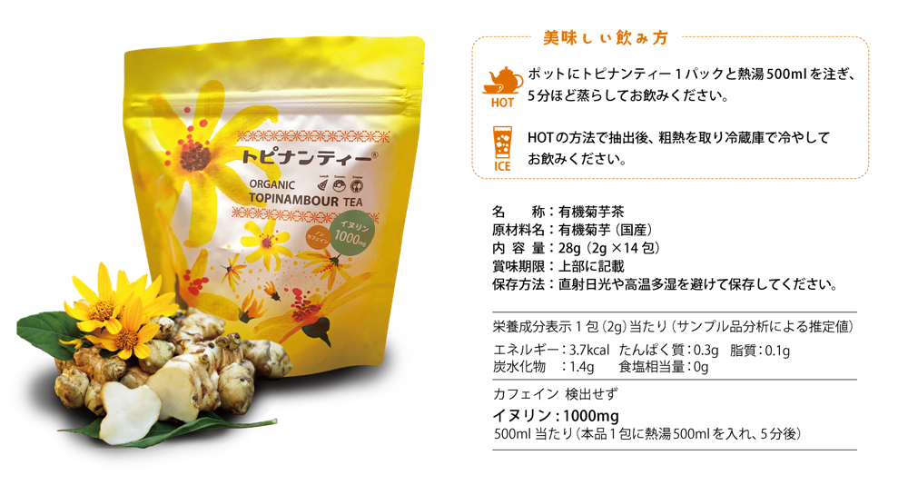 最大のこだわりは、“オーガニックであること”を徹底する姿勢。菊芋本来の栄養価や風味を損なわず加工するため、余分な添加物や保存料は不使用。自然の恵みだけを閉じ込めた安心・安全な製品づくりを実現。こうした取り組みによって、市場に多く流通する一般的なお茶とは一線を画す、確かな品質と信頼感を築いています。